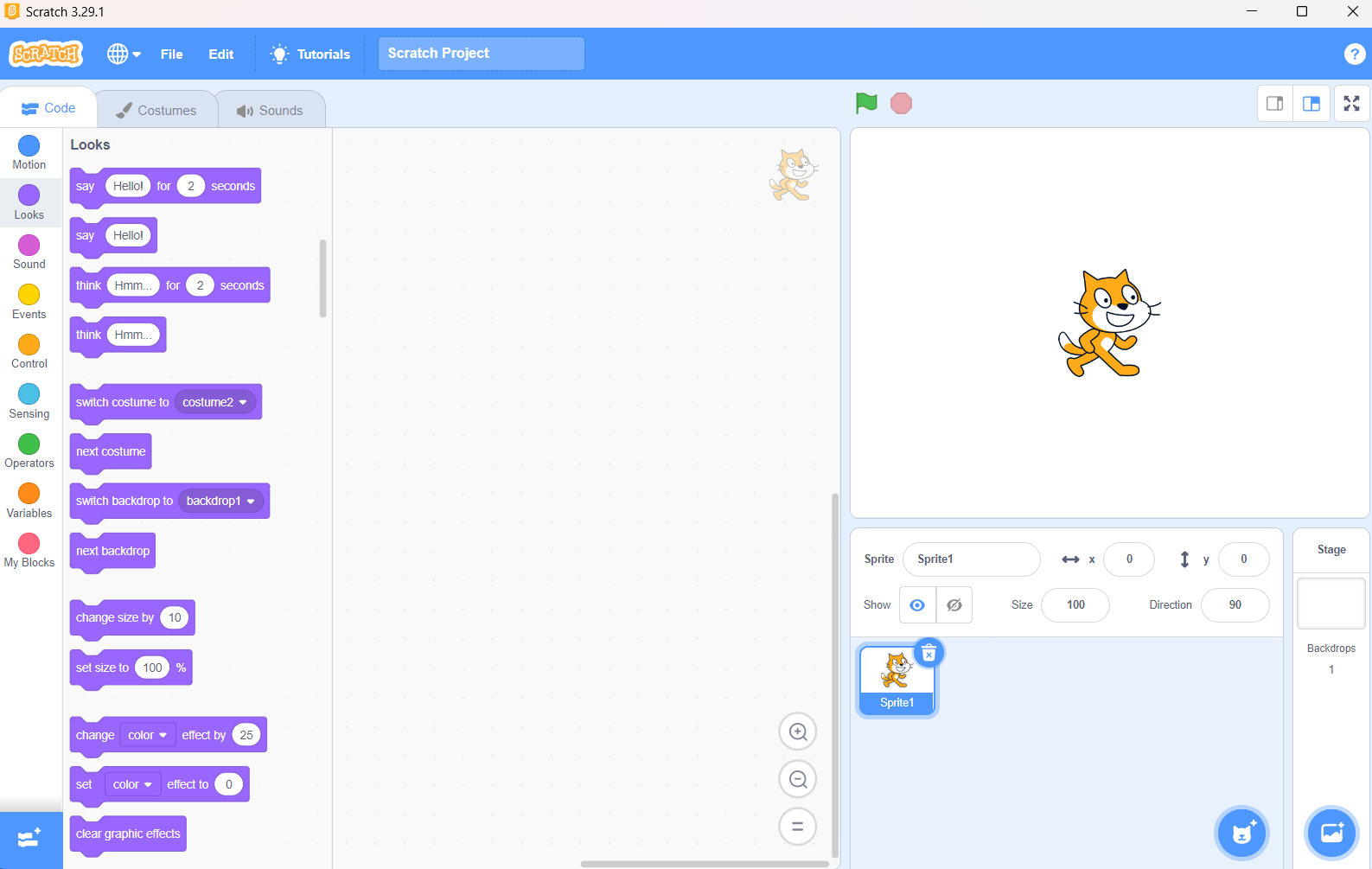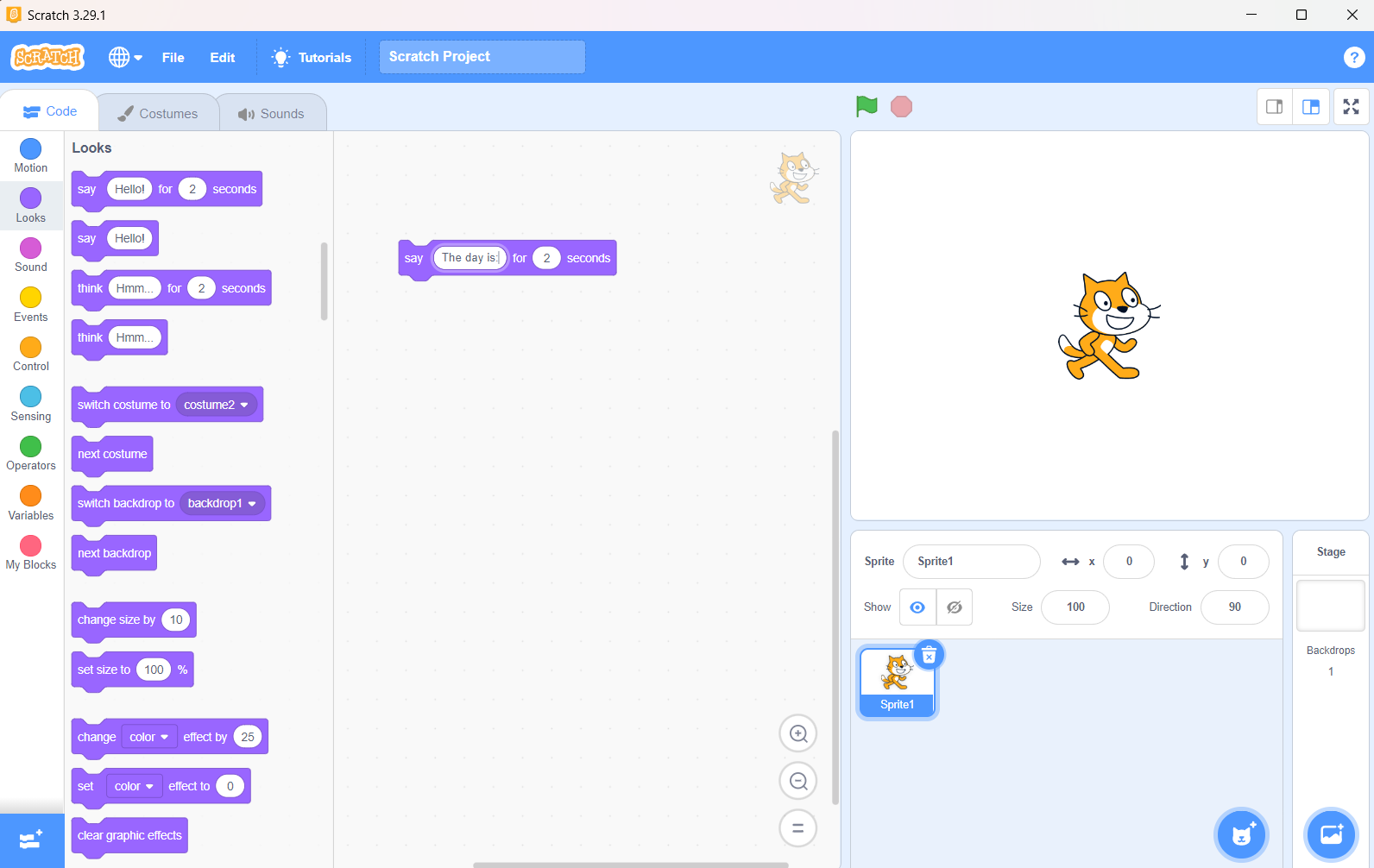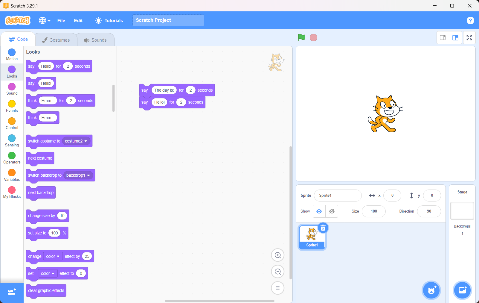 2. Go to "Looks" and drag and drop "Say Hello! for 2 seconds".