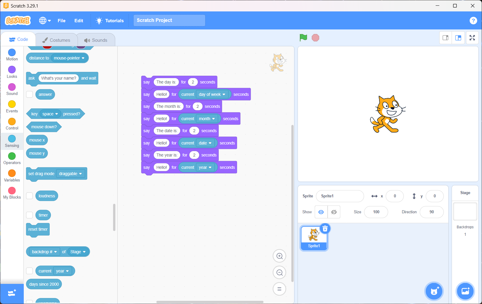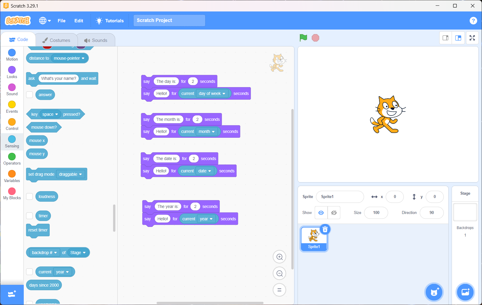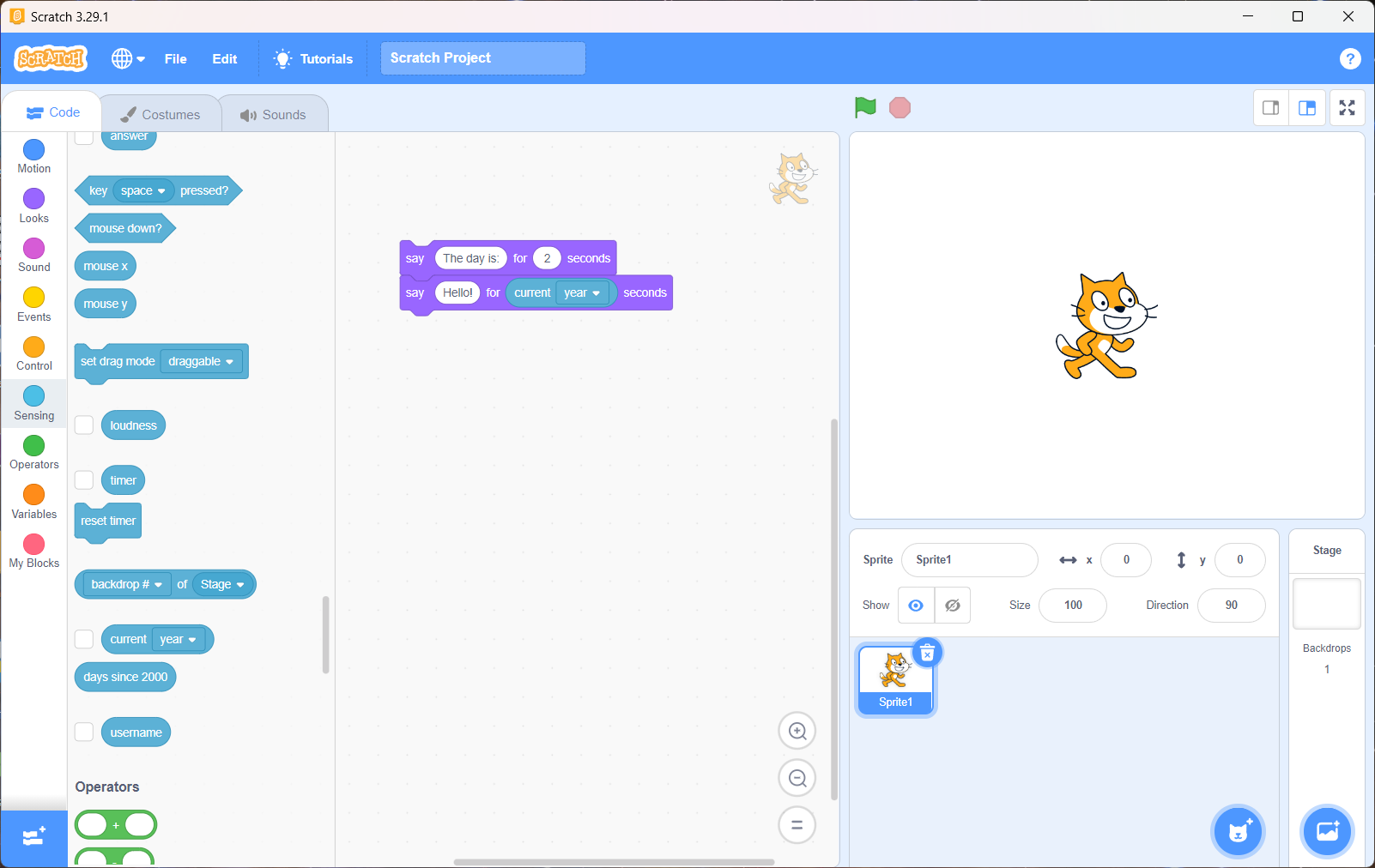 5. Click on "Sensing". Drag and drop "current year" onto the second say