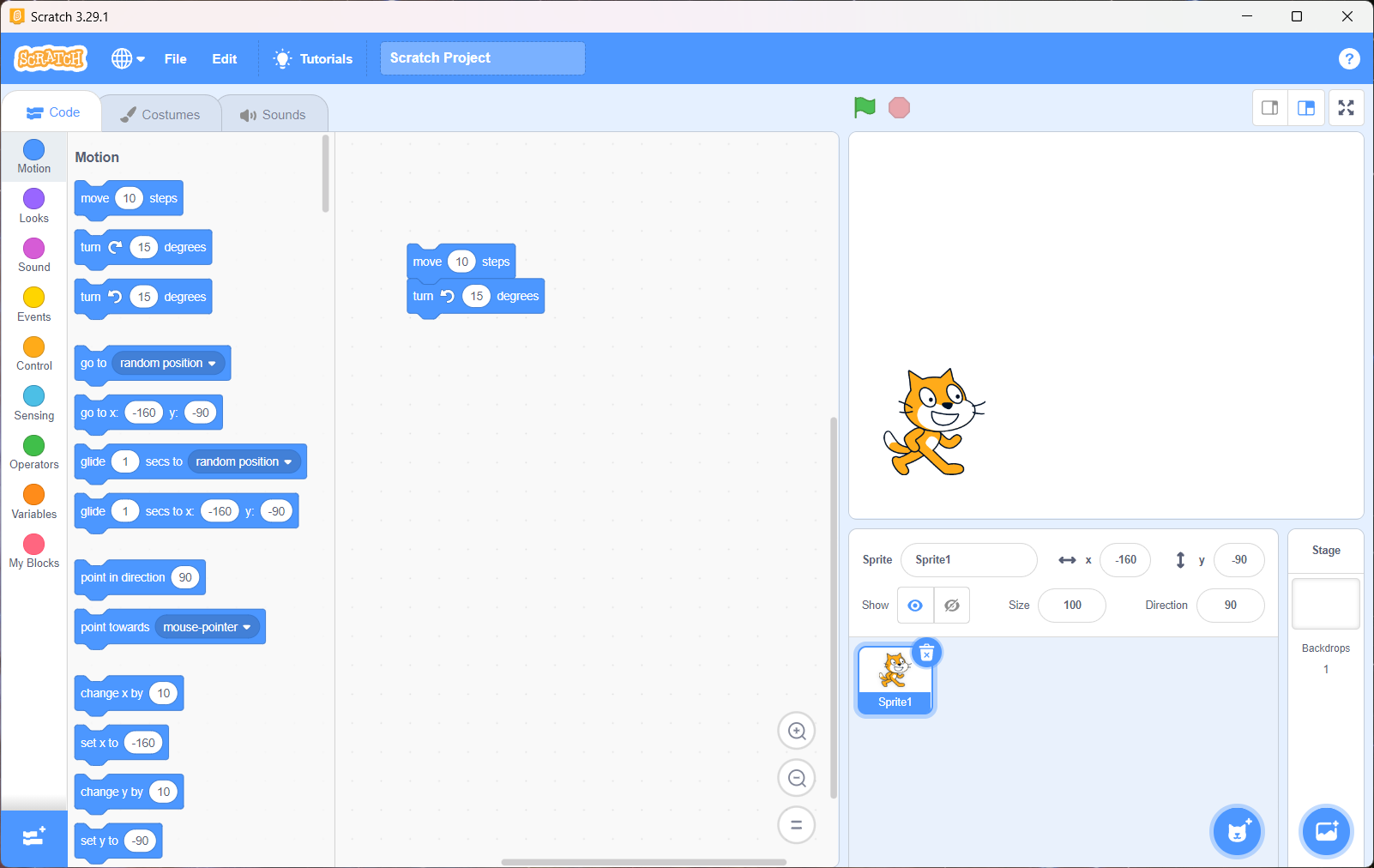 2. Go to "Motion" and drag and drop a "move 10 steps" and "turn counter-