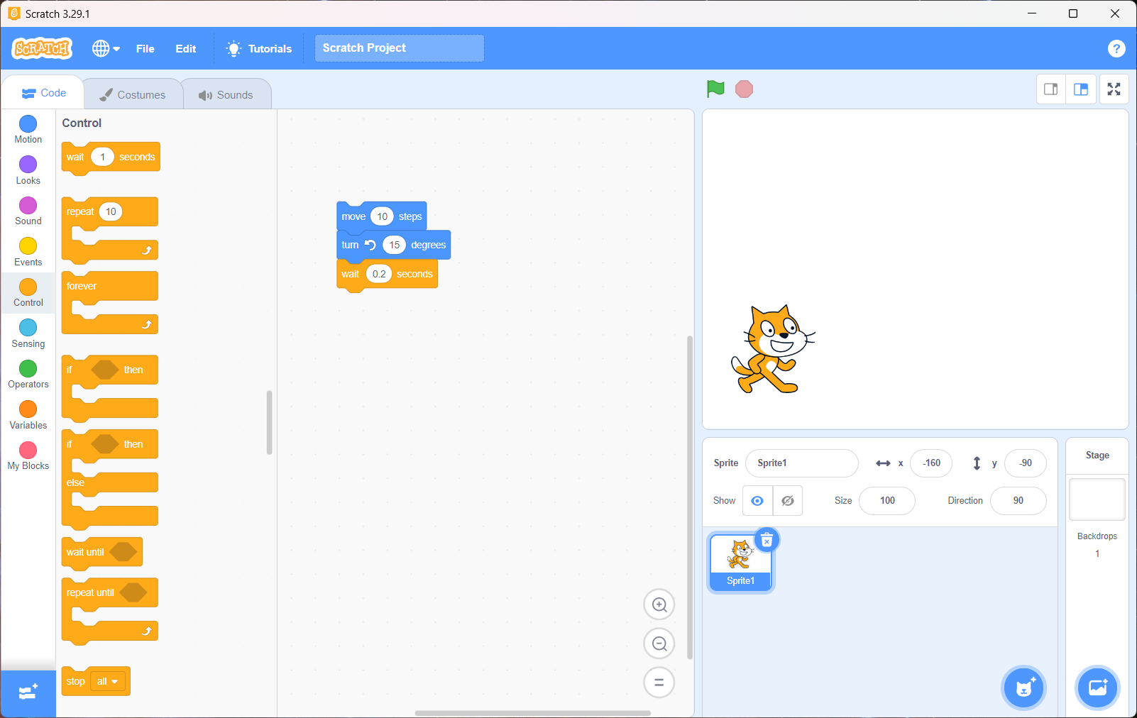 a "wait 0.2 seconds", a "move 10 steps", a "turn counter-clockwise 30