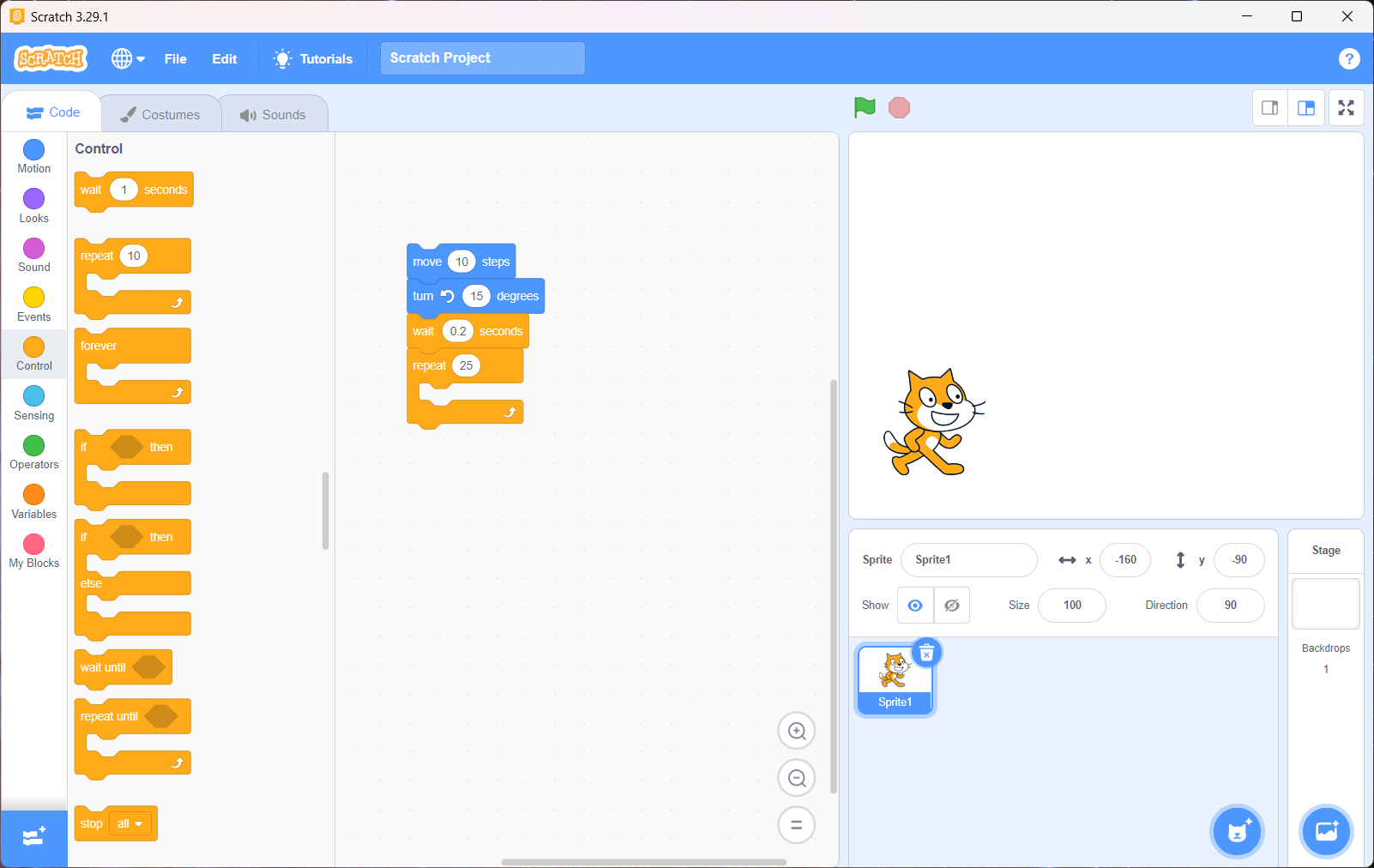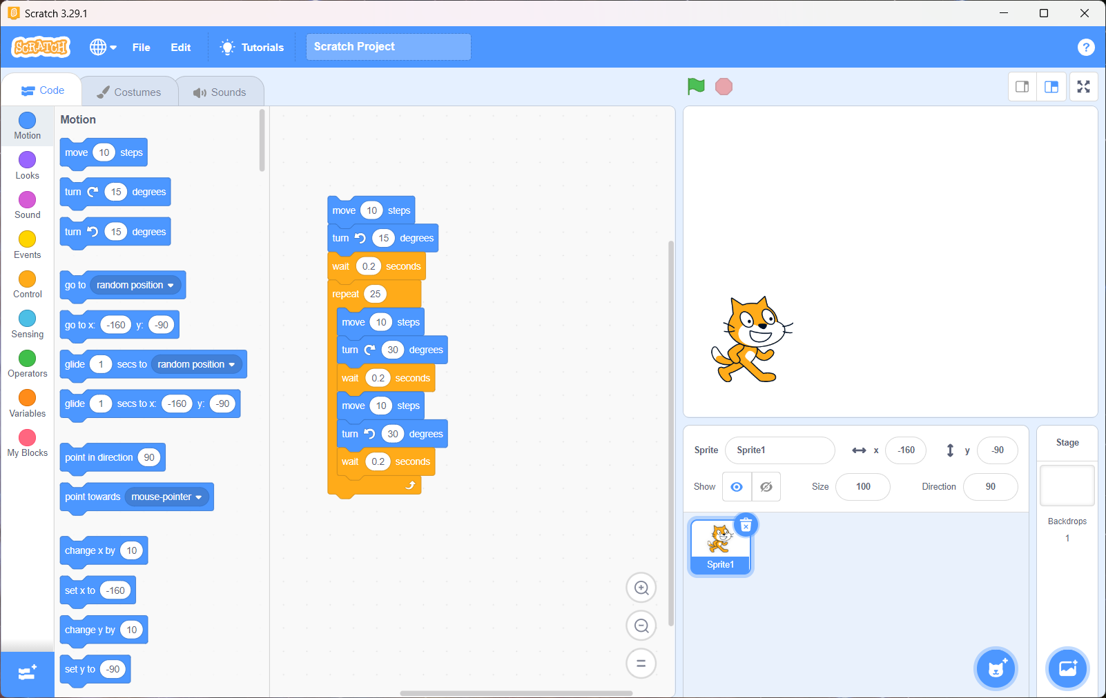 5. Inside the "repeat": Add a "Move 10 steps", a